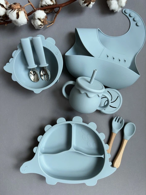 Набір посуду для малюка Діно Дасті блу 9 шт Набір посуду з харчового силікону для хлопчика (0009)
