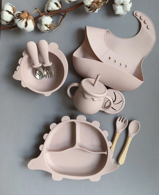 Набір посуду для малюка Діно Пудра 9 шт Рожевий набір дитячого посуду для годування Посуд для малюка (0011)