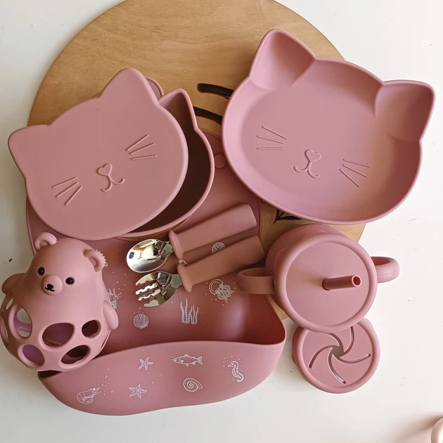 Набір дитячого силіконового посуду для дівчинки Котик Дарк Пінк з гризунцем (0076)