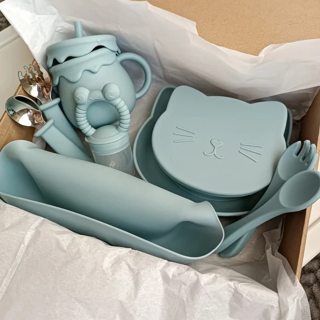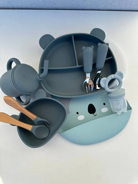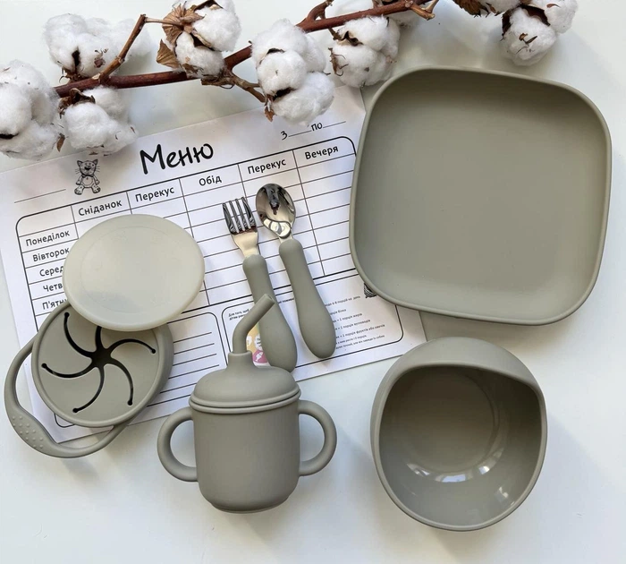 Набір посуду для малюка Хакі 8 шт Силіконовий набір посуду для малюків від 1 року Зручний посуд для дитини (0426)