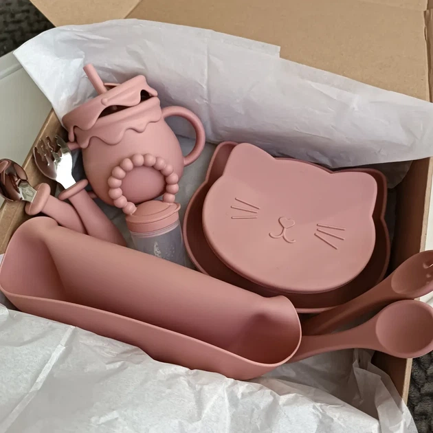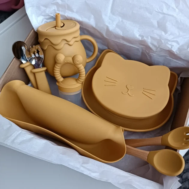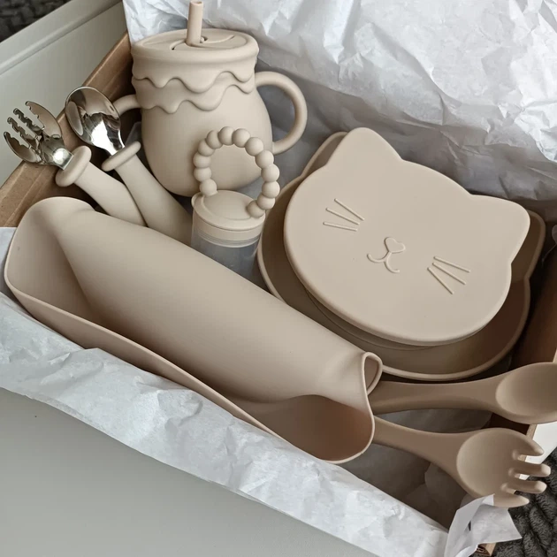 Великий набір силіконового посуду для дітей на присосках рум'янець котик