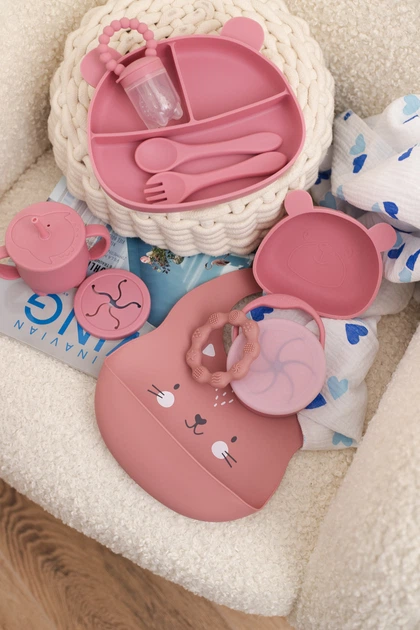 Набір посуду для малюка Котик Дарк пінк 11 шт Дитячий посуд для навчання самостійному харчуванню (0217)