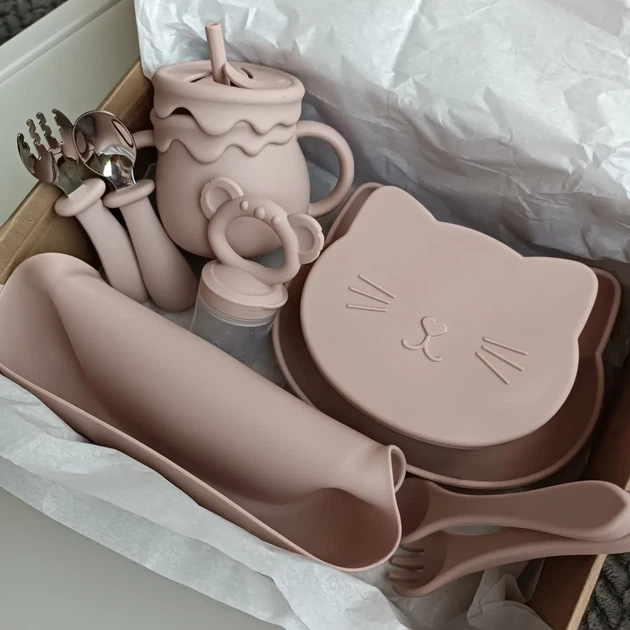 Набір посуду для малюка Котик пудра 11 шт Дитячий посуд для навчання самостійному харчуванню (0220)