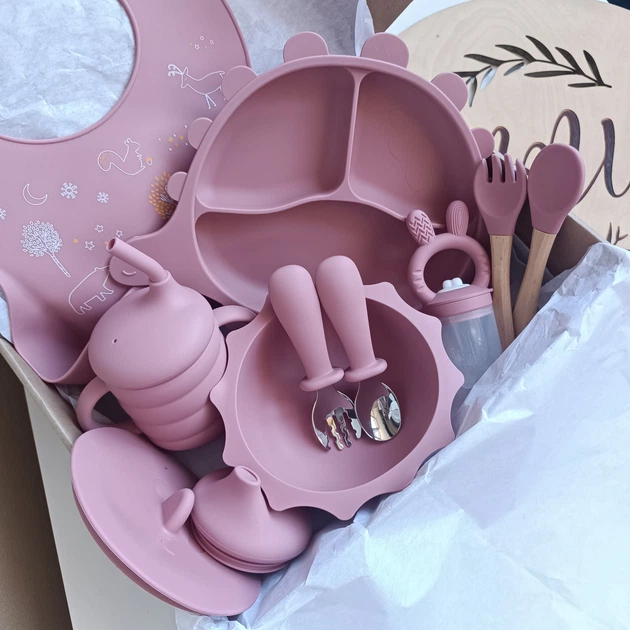 Набір посуду для малюка Динозаврик Дарк Пінк 10 шт Посуд для годування малюків Безпечний дитячий посуд (0210)