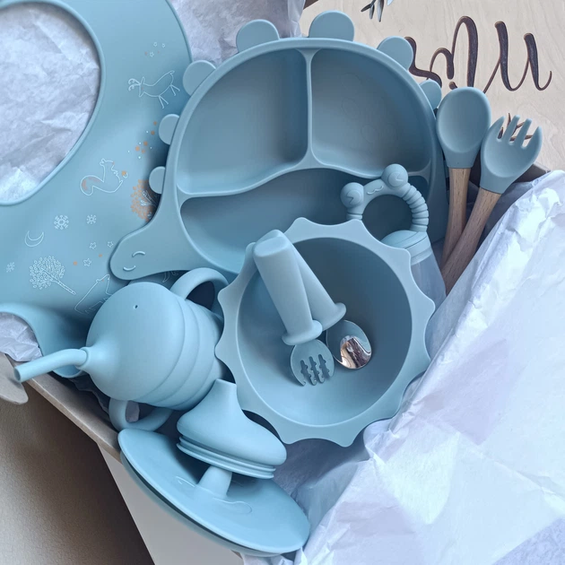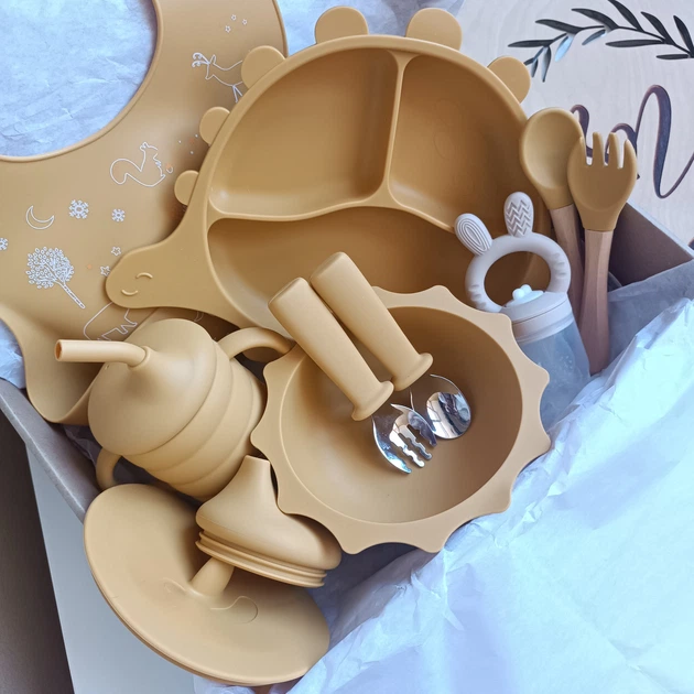Набір посуду для малюка Динозавр Манго 11 шт Великий подарунковий набір силіконового посуду для прикорму (0213)