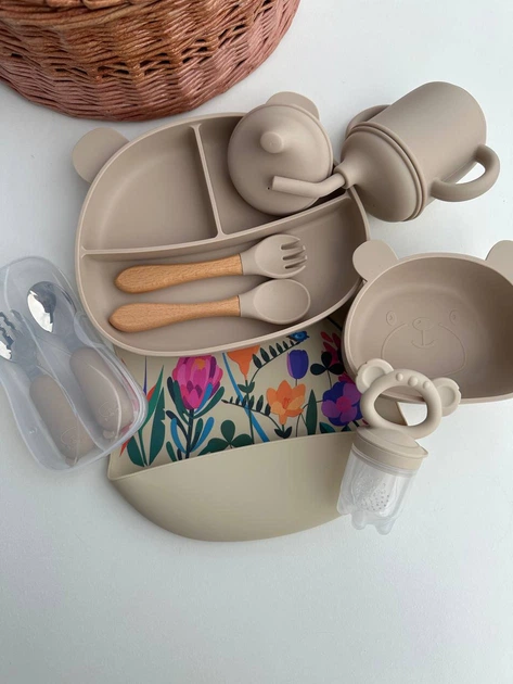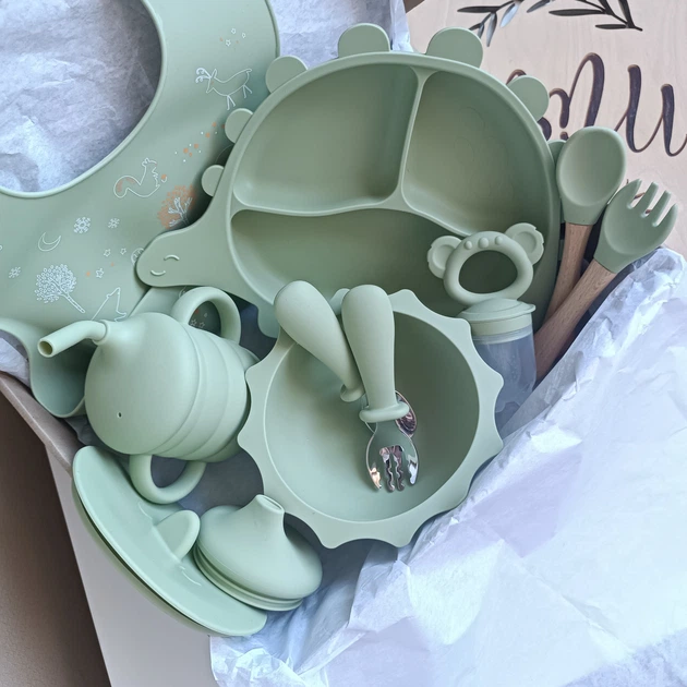 Набір посуду для малюка Динозавр Оливка 10 шт Дитячий посуд для навчання самостійного харчування (0208)