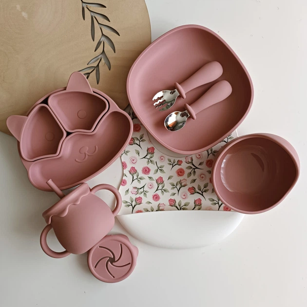 Набір посуду для малюка Єнотик Темно-рожевий 7 шт Дитячий набір для годування дитини Комплект для годування дитячий (0285)