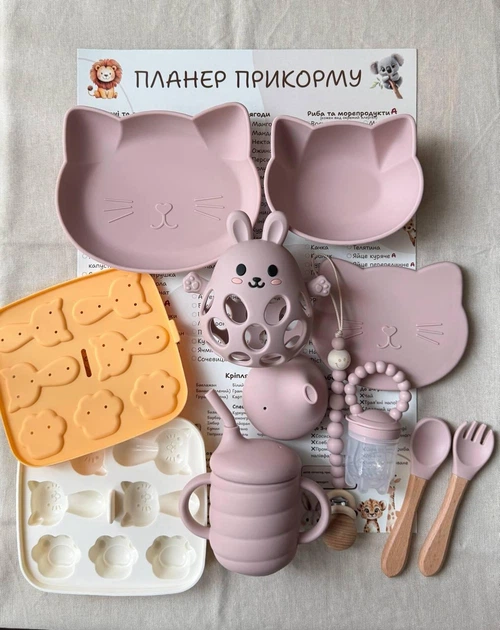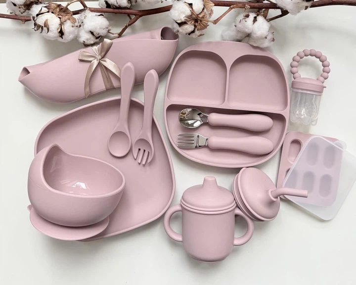 Набір дитячого силиконового посуду із 12 предметів із сертифікованого, безпечного, харчового силикону Rose pink (Рожевий)
