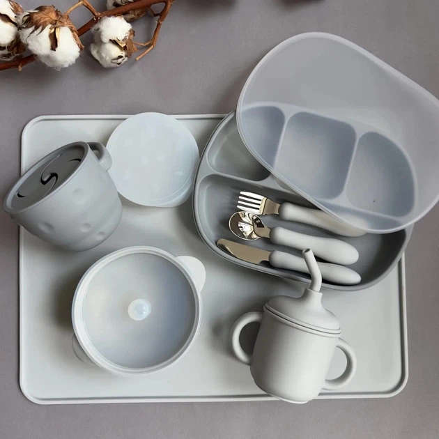 Набір посуду для малюка Темно-сірий 10 шт Дитячий посуд із силікону Набір столового посуду для дітей (0207)