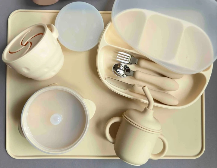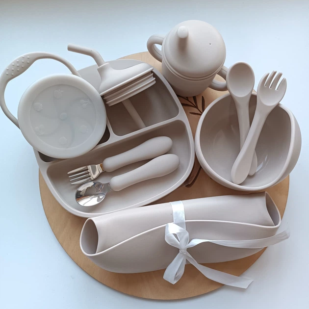 Набір посуду для малюка Бежевий 10 шт Силіконовий набір для прикорму Посуд для малюка з розділеною тарілкою (0211)