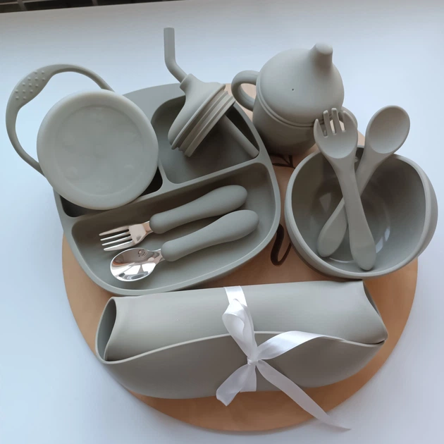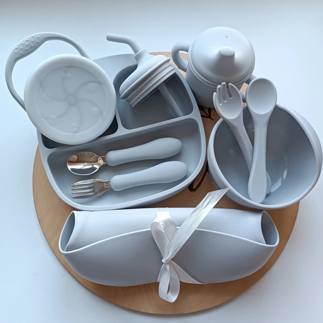 Набір посуду для малюка Сірий 11 шт Посуд для годування малюків Набір дитячого посуду для дітей (0157)