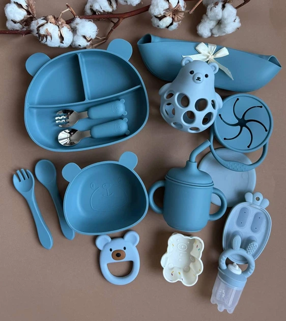 Набір дитячого силіконового посуду з 12 предметів синій Звірята сірий Пакунок малюка
