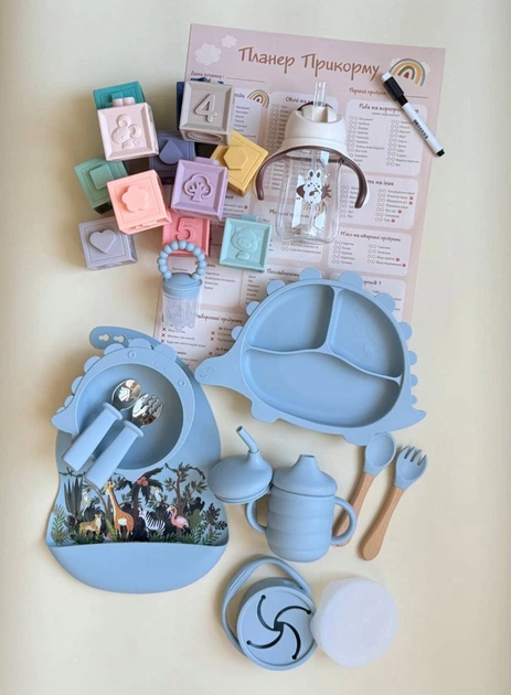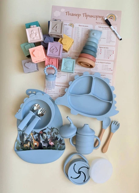 Набір дитячого силиконового посуду на 19 предметів із безпечного та харчового силикону + Іграшка Монтессорі + Ланч-бокс