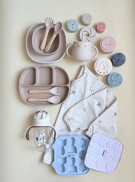 Набір силіконового посуду з 12 предметів із якісного, безпечного та харчового силикону + Набір кубиків 12 штук із силікону +