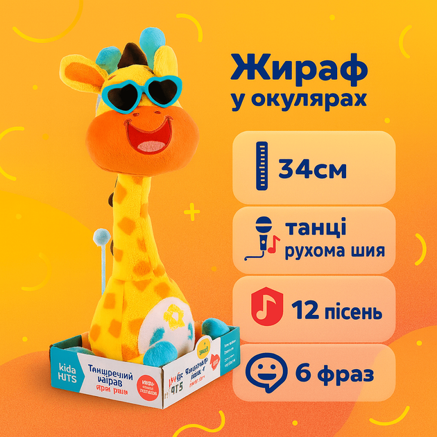 Жираф в окулярах Kids Hits 34см танцюючий/рухлива шия/12 пісень/6 фраз, м'яка інтерактивна іграшка KH37-001