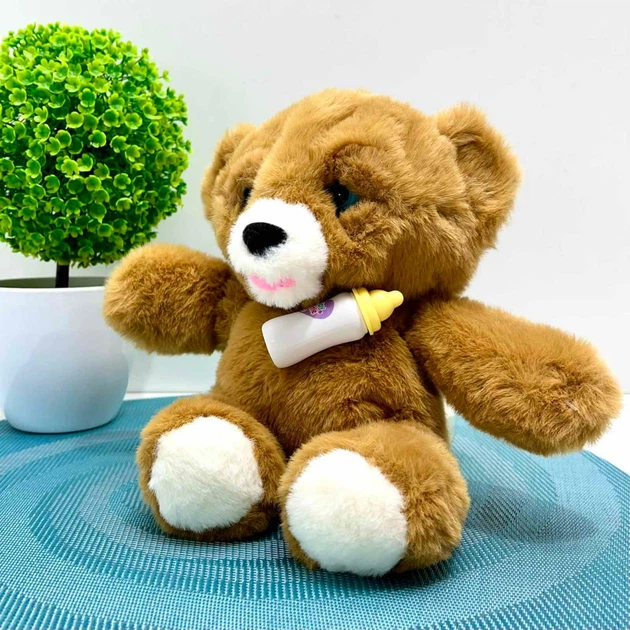 Ведмедик інтерактивний м'який пляшечка в комплекті моргає сенсорний та магнітний датчик звук 24см Коричневий (933-216 E)
