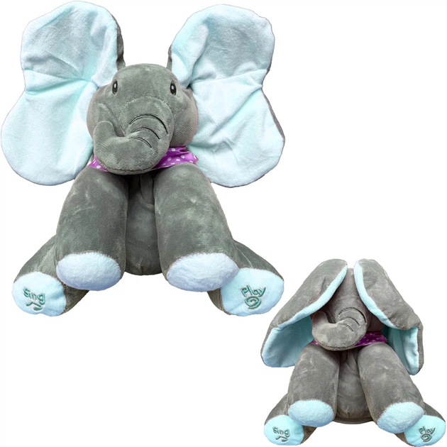 М'яка музична іграшка Слоник з вухами, що рухаються, і голосовими функціями, співає і грає в хованки 25 см Сірий/Блакитний