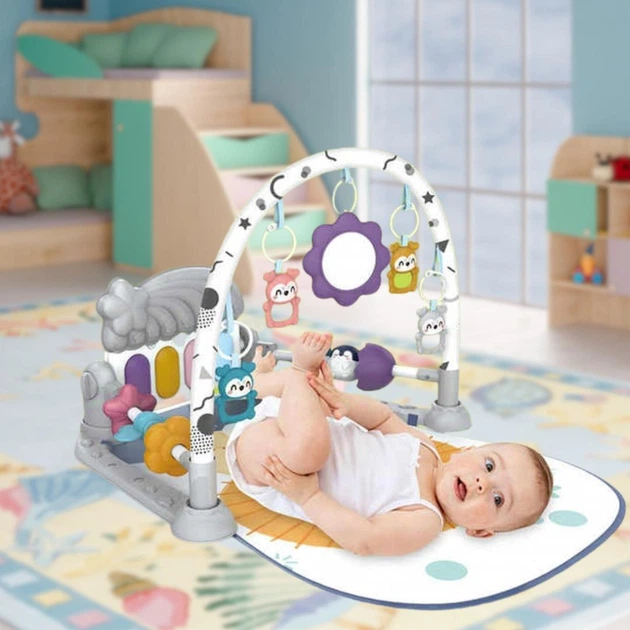 Дитячий музичний розвиваючий килимок з піаніно, брязкальцями, безпечним дзеркальцем та пальчиковою грою «Пінгвін» для всебіч