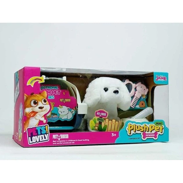 Інтерактивна іграшковка рухлива Собака Dog White 070, плюшева рухлива собачка з набором для догляду переноскою та звуковими