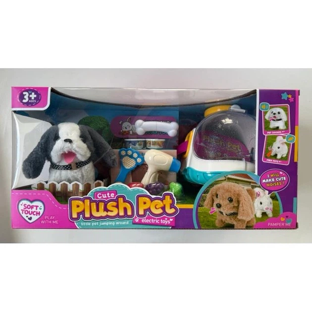 Інтерактивна іграшка Dog Gray 070, собачка рухлива плюшева з переноскою та набором аксесуарів для догляду