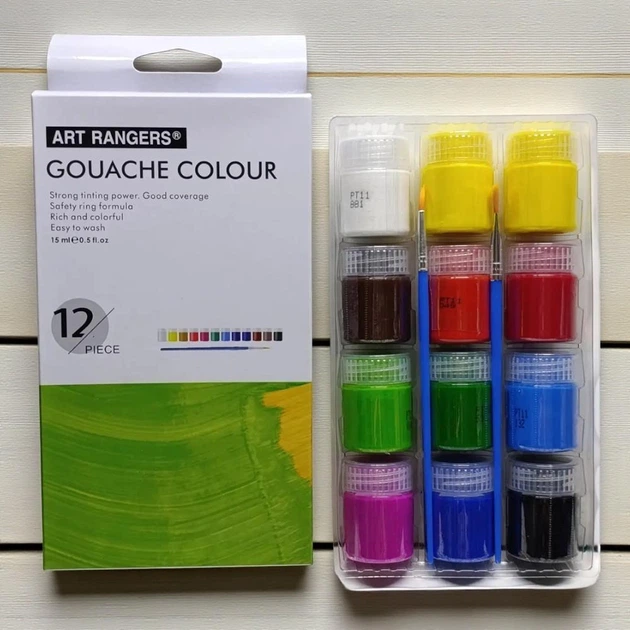 Гуаш художня, набір 12 кольорів по 15 мл у баночках з пензлем