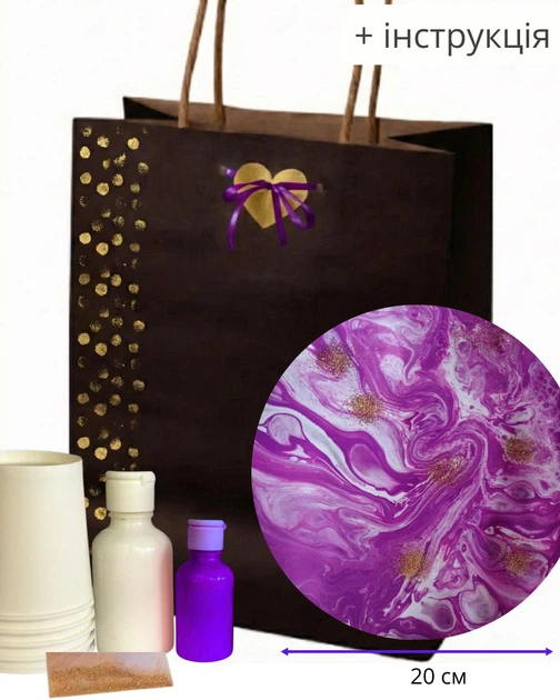 Набір для флюїд арту Фіолетово-білий з блискітками (рідкий акрил для малювання картини). Полотно ДВП біле кругле 20см.