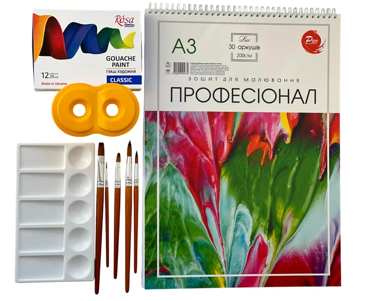 Набір художніх матеріалів для живопису гуашевими фарбами. Набір юного художника