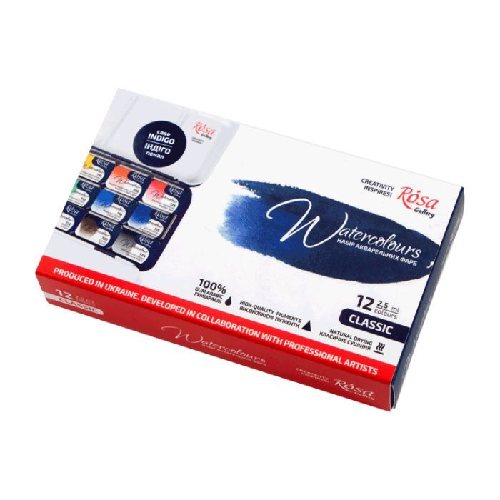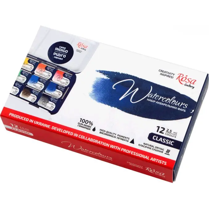 Набір акварельних фарб Clssic металевий пенал Індіго 12 кольорів х 2,5 мл кювета Rosa Gallery