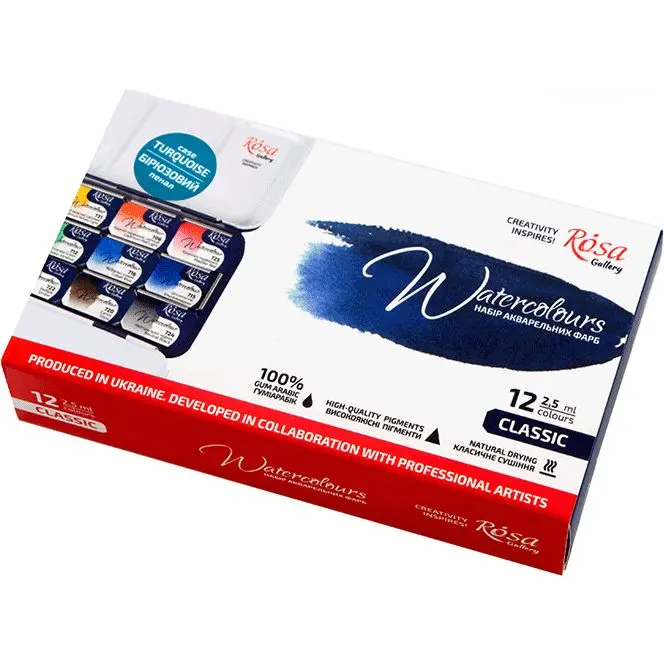 Набір акварельних фарб Clssic металевий пенал Бірюза 12 кольорів х 2,5 мл кювета Rosa Gallery