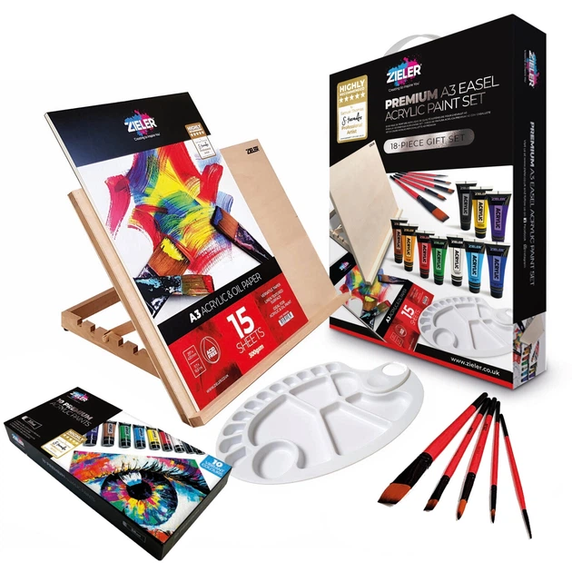 Акрилові фарби Zieler: 10 кольорів фарб по 38 мл, мольберт, блокнот А3, набір пензлів, палітра