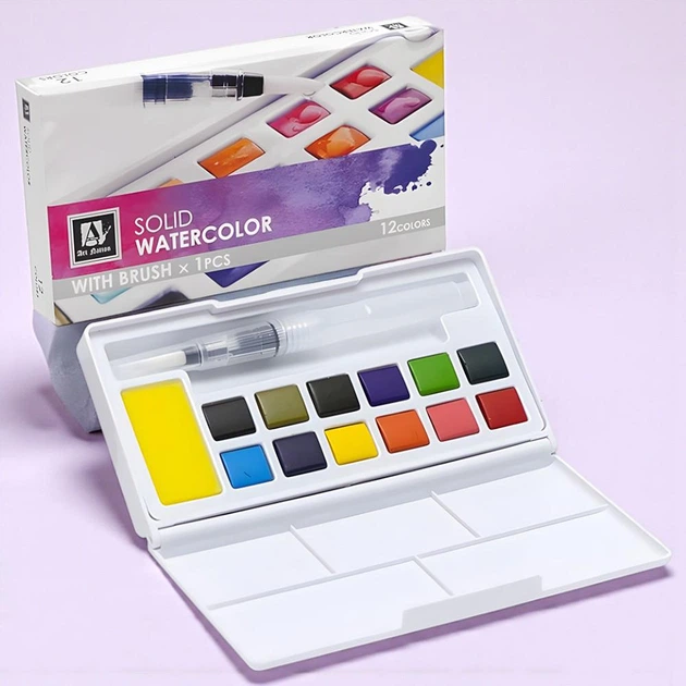 Акварельні фарби художні, набір 12 кольорів у кюветах, пластикова коробка з пензлем