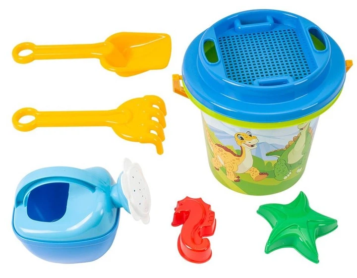 Пісочний набір ТехноК-5 з динозаврами відерце лопатка грабельки сито лійка 2 пасочки зелений 0106