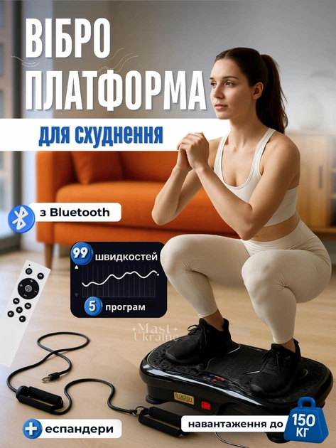 Віброплатформа тренувальна з пультом та еспандерами, вібраційний фітнес-тренажер для схуднення і зміцнення м’язів з дисплеєм