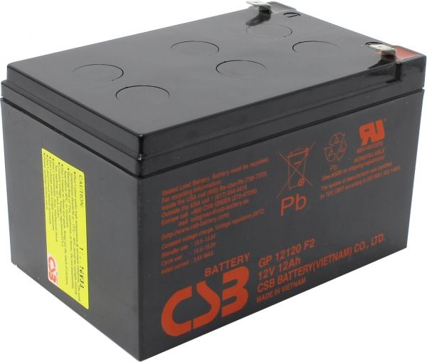 CSB 12В 12 Ач (GP12120 F2) - це свинцево-кислотна, не обслуговуюча батарея з номінальною напругою 12В і місткістю 12 Ач. Також дана батарея характеризується низьким рівень саморозряду.