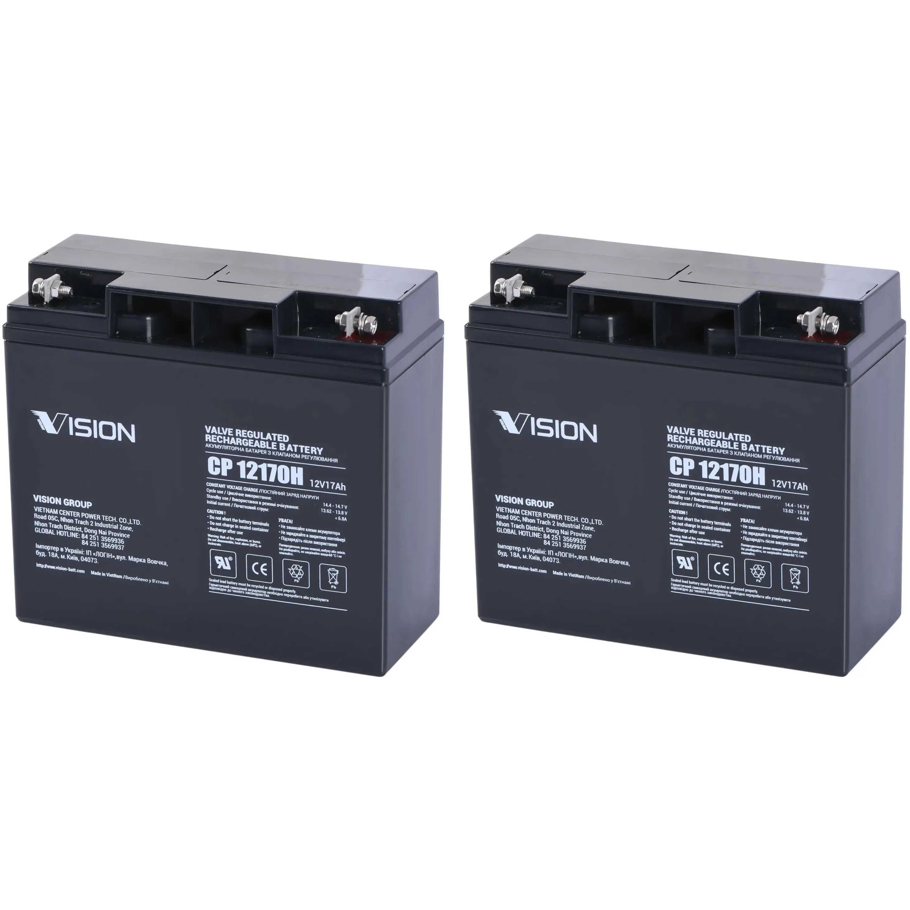 Акумулятори Vision серії CP ― герметизовані свинцево-кислотні акумуляторні батареї, що обслуговуються, електроліт яких абсорбований у скловолокнистий наповнювач (технологія AGM). Акумулятори не вимагають обслуговування та доливання води протягом усього терміну служби. Кожен елемент акумулятора має запобіжний клапан. Корпус виготовлений із газонепроникної пластмаси ABS. Допускається експлуатація акумулятора у будь-якому положенні без витоку електроліту.Тип пристроюакумулятор Vision серії CPТехнологіяAGMНапру