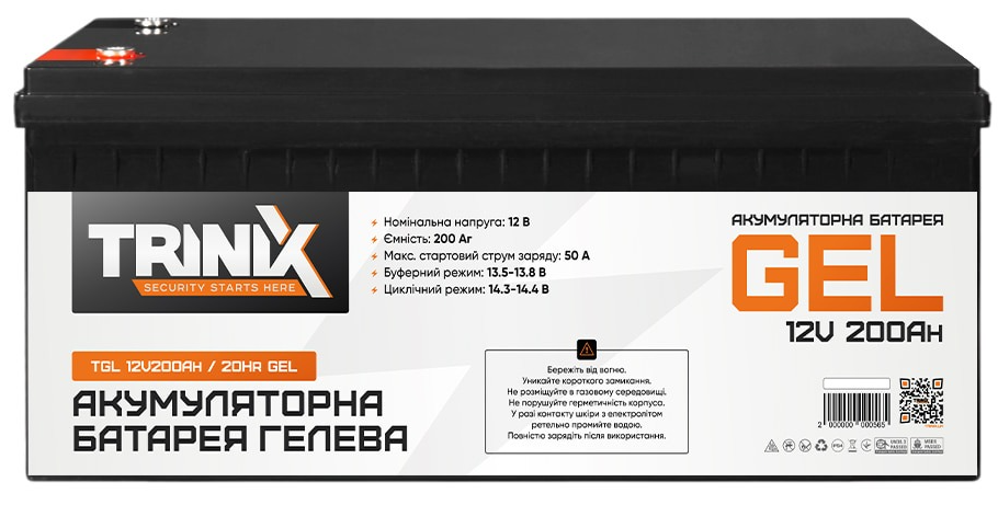 Акумуляторна батарея TRINIX TGL12V200Ah/20Hr – це гелева акумуляторна батарея, призначена для забезпечення безперебійного живлення в системах охорони та пожежної сигналізації, СКУД, систем відеоспостереження. Акумуляторні батареї з технологією виробництва GEL мають багато переваг: - триваліший термін експлуатації (до 10 років); - велика кількість циклів розряду; - робота в умовах глибшого розряду батареї; - незначна втрата ємності в неробочому стані; - найкраще працює при низьких температурах. ]]>