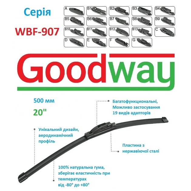 Щітка склоочисника безкаркасна універсальна GoodWay 500 мм 20" ( WBF-907-20 )