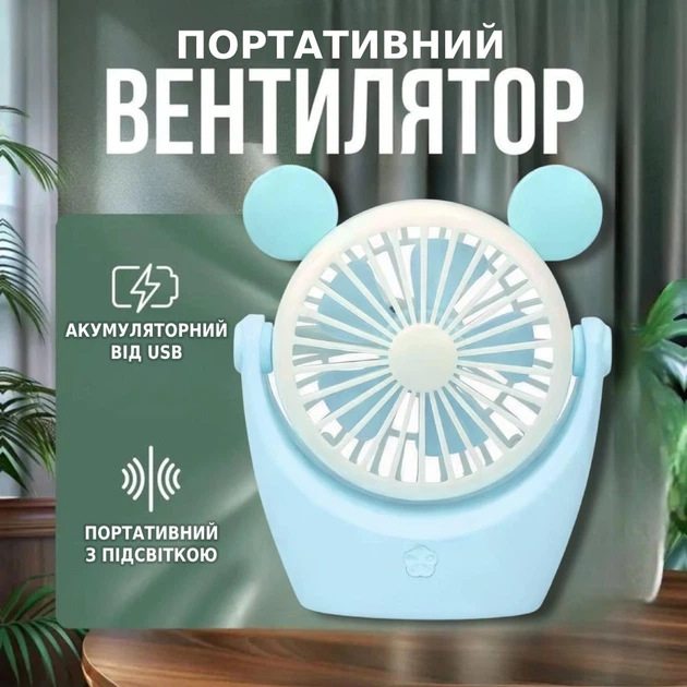 Міні вентилятор акумуляторний Компактний настільний з підсвічуванням і зарядкою від USB або павербанка Блакитний