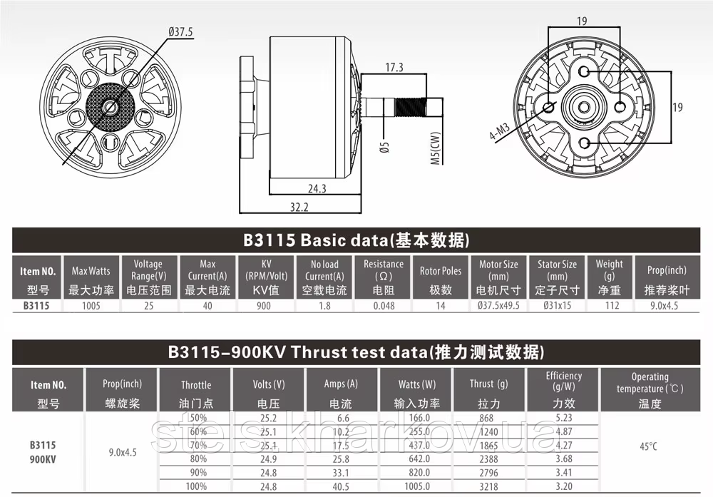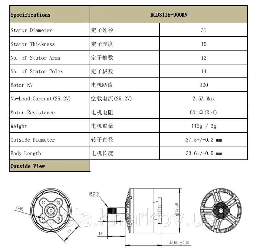 - KV: 650 - Діаметр статора: 35 мм - Висота статора: 30 мм - Вага: 219 г