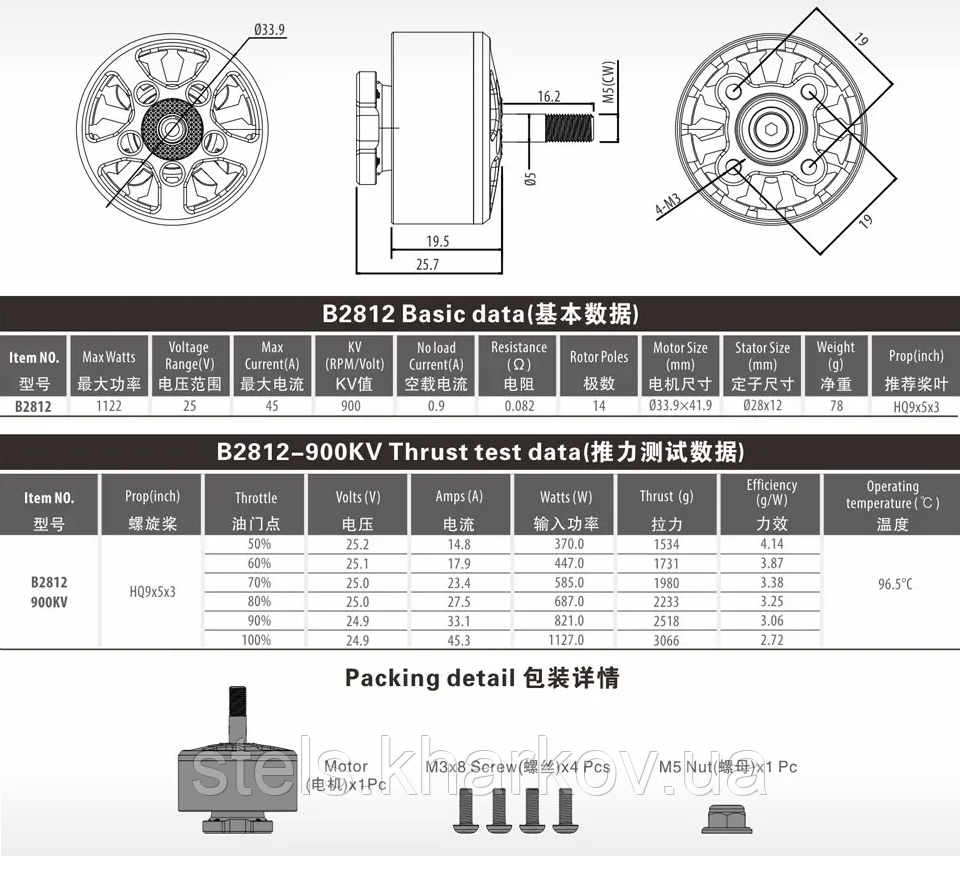Пакування: коробка RTL Стан: новий Гарантія: 14 днів Кількість моторів у комплекті - 1 Комплектація до мотору: Набір болтів M3 х 8мм (4 шт) Притискна гайка (1 шт) Фіксатор гайки (1 шт.) Рекомендована рама: 10" Рекомендований пропелер: 9.0×4.5