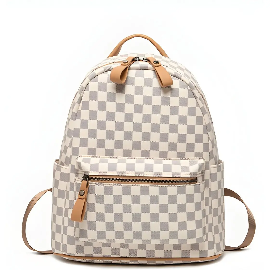 Повсякденний жіночий рюкзак з екошкіри 30х13х35 см світло-бежевий у клітинку (2255)