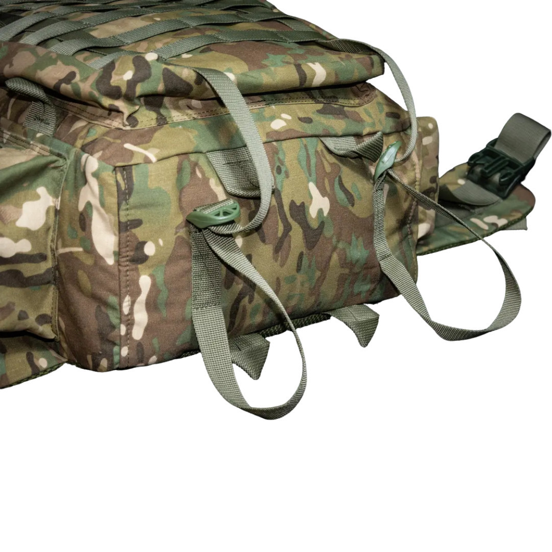 Військовий рюкзак призначений для зберігання та перенесення екіпіровки, особистих речей, виконання військових завдань, риболовлі, туризму, полювання, спорту тощо. Данна модель розрахована на кількість провізії та речей на період до 15 днів на одну особу. У цій моделі достатньо відділень для комфортного розміщення необхідних речей. У горловині рюкзака є фіксатор-затяжка, що