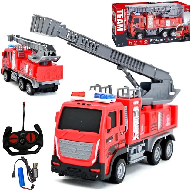 Дитяча радіокерована пожежна машина з пультом, зарядкою і акумулятором, світлові ефекти 1:16