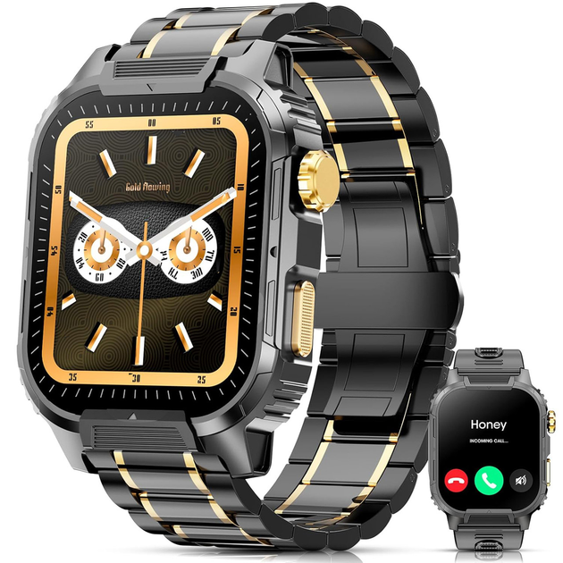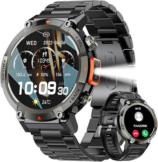 Чоловічий смарт-годинник AMOLED 1.45" з ліхтариком, IP67, дзвінки по Bluetooth, тонометр, пульсоксиметр, фітнес-браслет