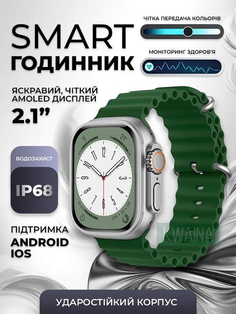 Смарт-годинник з AMOLED-дисплеєм 1.95", IP68, функцією дзвінків, моніторингом здоров'я та спортивними режимами, зелений
