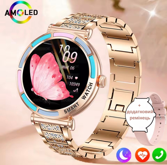 Смарт-годинник жіночий Lemfo T9 Gold (розмова, пульсоксиметр) 2 ремінці Amoled екран