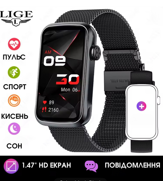 Смарт годинник LIGE S22T Black (пульсометр, моніторинг кисню в крові) 2 ремінці