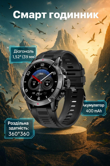 Смарт-годинник Modfit Hunter Army All Black 36 мм | 1,39" IPS, 400 мАг, 360 x 360 ,128MB, HeartRate, IP67 | Чорний