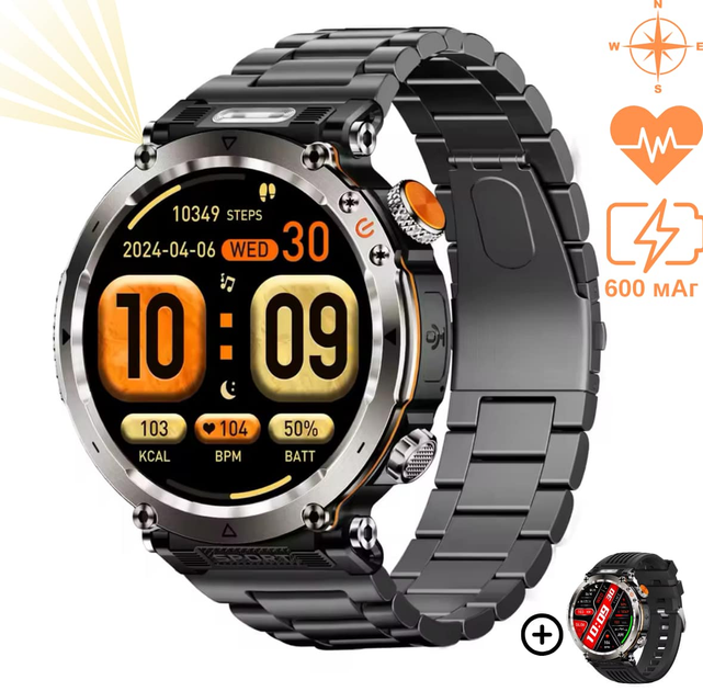 Смарт годинник чоловічий Lemfo HT30 (розмова, пульсоксиметр, компас, ліхтарик) 2 ремінця, 600мАг