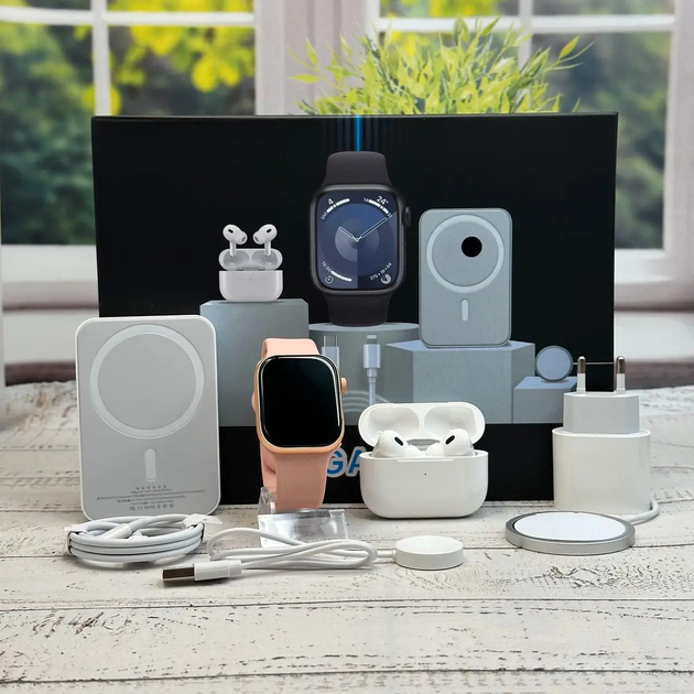 Набір комплект Megabox 6в1: Smart Watch 9, навушники Air Pro 2, павербанк, блок живлення рожевий